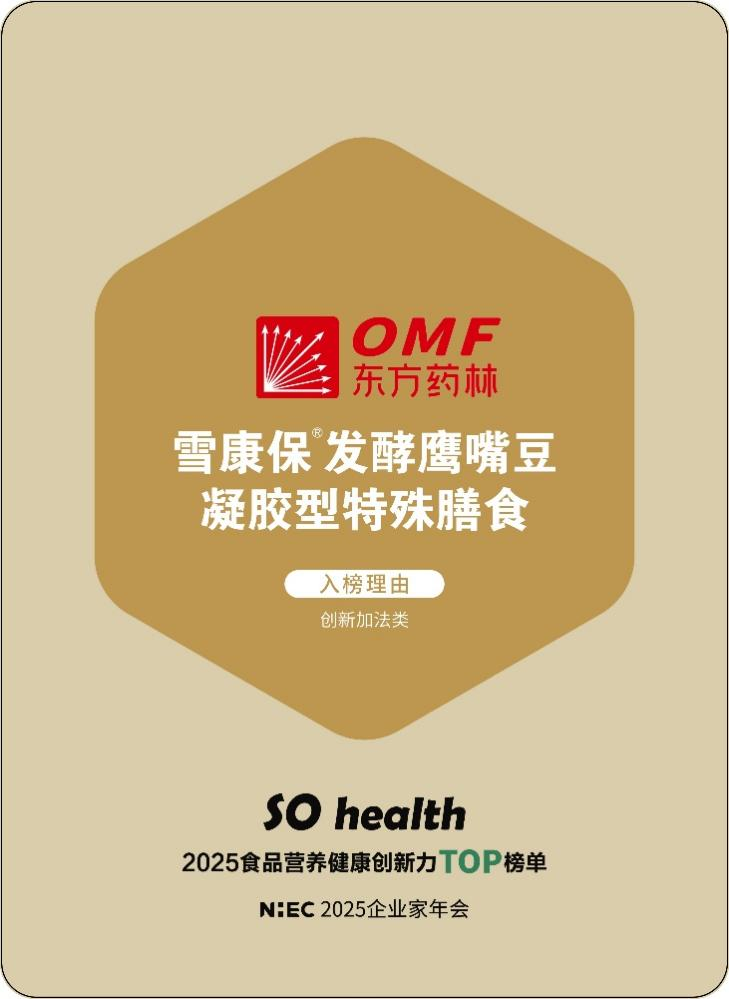 近日,在由中国保健协会主办的“SO health 2025食品营养健康创新力TOP榜单”评选中,东方药林药业有限公司研发的“雪康保®发酵鹰嘴豆凝胶型特殊膳食”凭借其在剂型创新与航天生物技术融合方面的突破,从众多参赛产品中脱颖而出,成功入选该榜单。